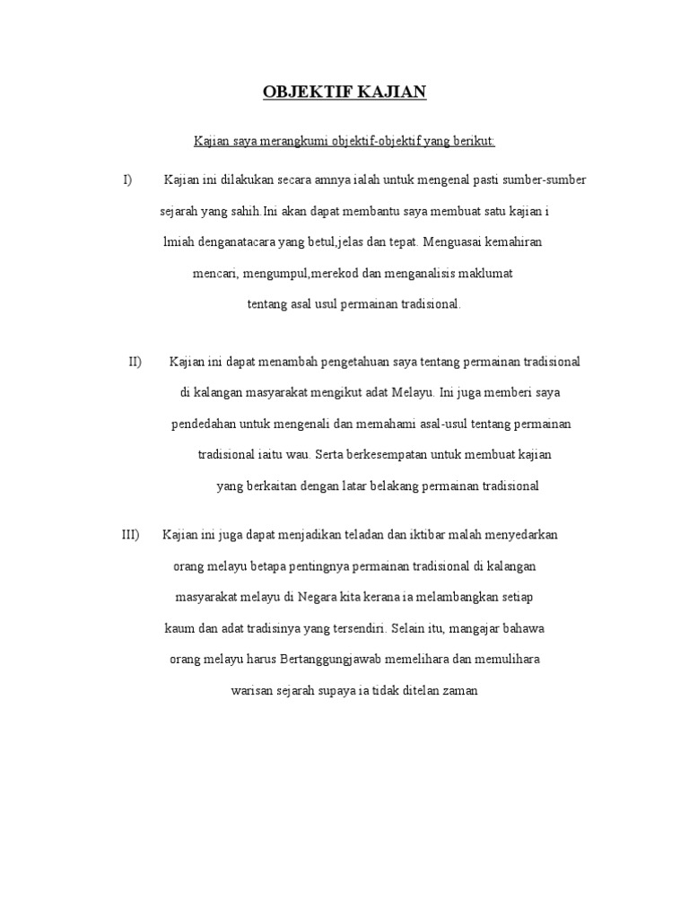 Contoh Ayat Objektif Kajian Sejarah. Assalamualaikum dan salam sejahtera. Bil Isi Kandungan Mukasurat 10 Penghargaan 20 Pendahuluan 30 Objektif kajian 40 Kawasan Kajian 50 Kaedah Kajian a Kaedah Pemerhatian b Kaedah Temubual c Kaedah Rujukan 60 Dapatan kajian 70 Rumusan 80 Lampiran 90 Rujukan 2 10 PENGHARGAAN Syukur Alhamdulillah kepada.